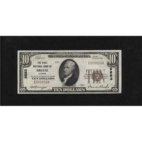 <B>Breese, IL</B></I> - $10 1929 Ty. 1 <B>The First NB</B></I> Ch. # 9893<BR>A high grade example which is certain to please. <B>Choice About Uncirculated.</B></I>