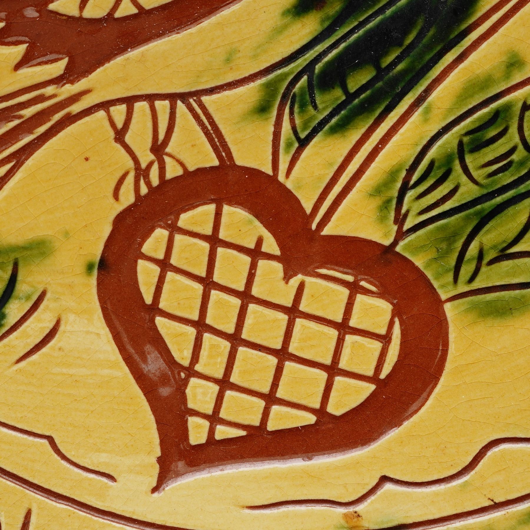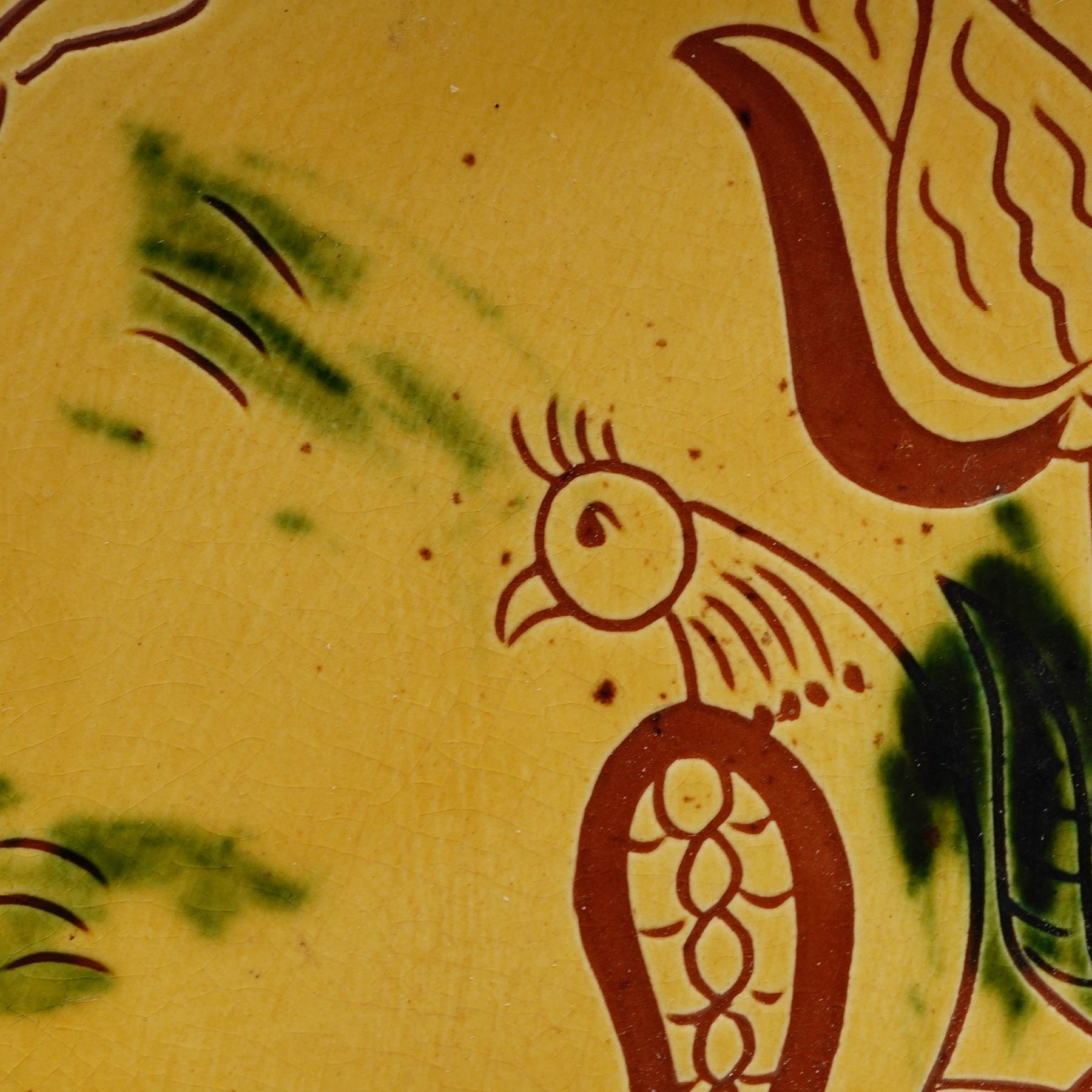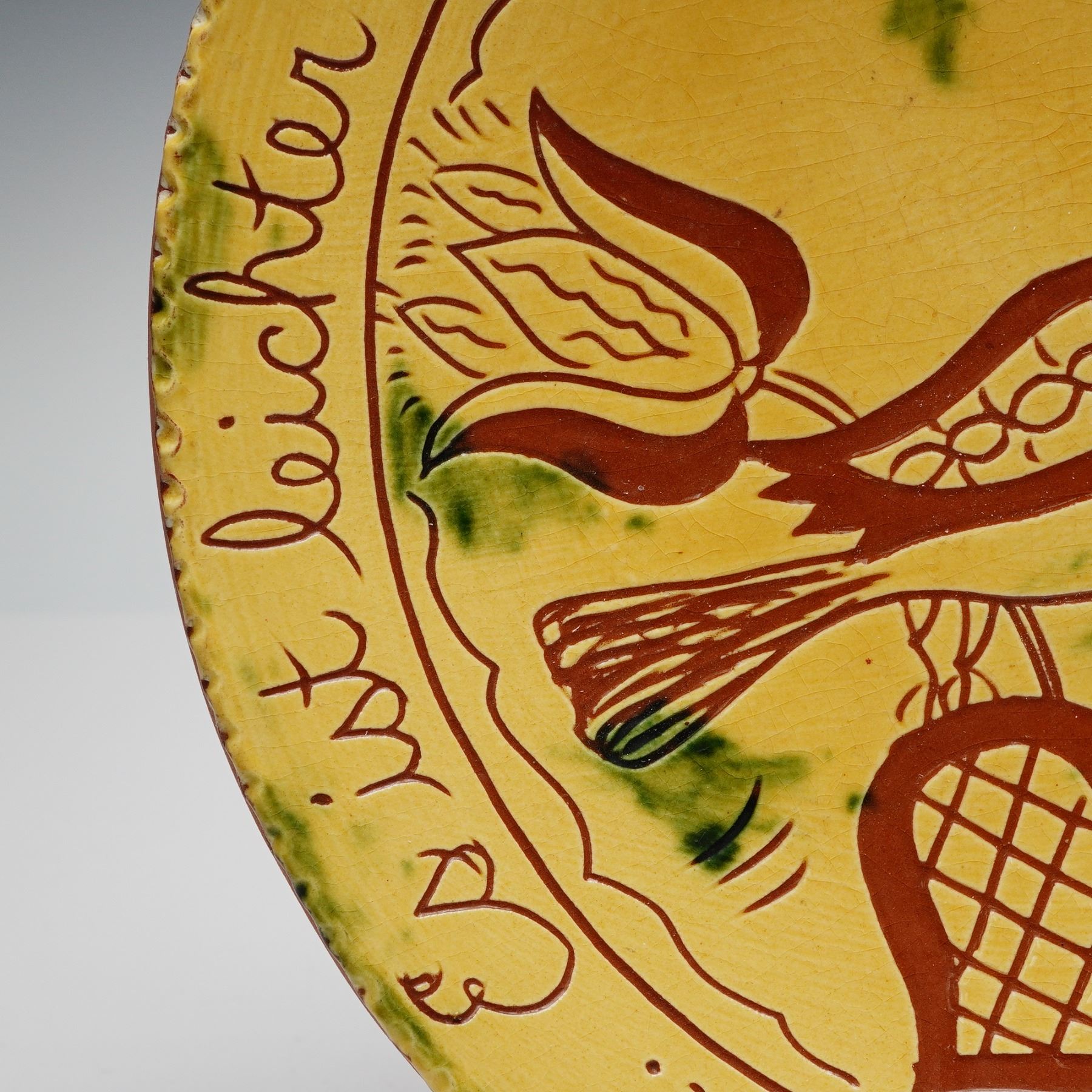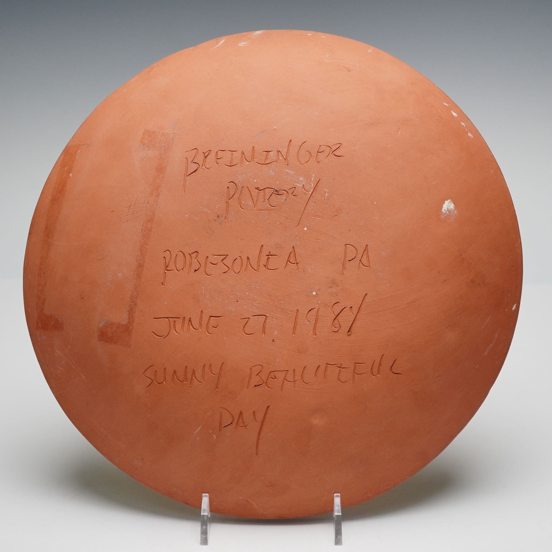 Handcrafted redware pottery plate by Clarence Breininger of Robesonia, Pennsylvania, dated June 27, 1984 and inscribed on the reverse with "Sunny Beautiful Day." Decorated in the traditional Pennsylvania Dutch sgraffito style, the plate features a central bird alongside a tulip and heart, surrounded by a hand-incised German script inscription. Rendered in earthy tones of mustard yellow, deep red, and green, the piece reflects Breininger's dedication to reviving 18th and 19th century Pennsylvania German folk pottery traditions.