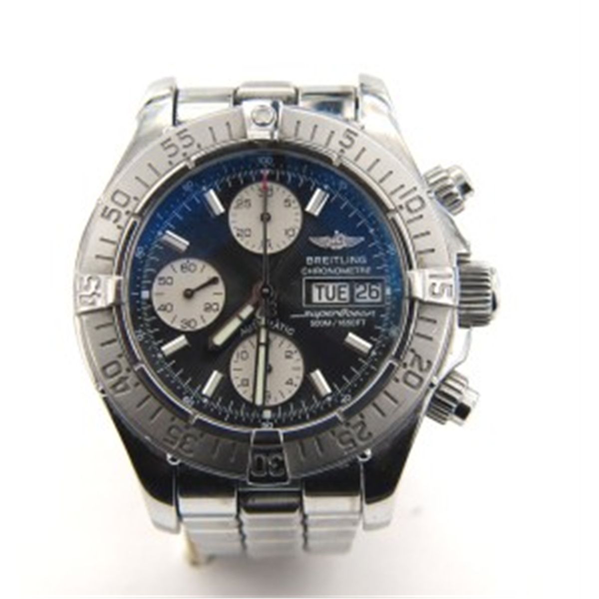 Breitling Chronograph Mens Wristwatch with Original Box.The total watch's weight is 191 grams.The measurements of watch head is 41 x 46 mm and 17 mm thick.The length of watch: 7.25"Case Type: Stainless steel.Automatic, Chronograph.water Resistant.swiss made.Chain is 19 mm wide
