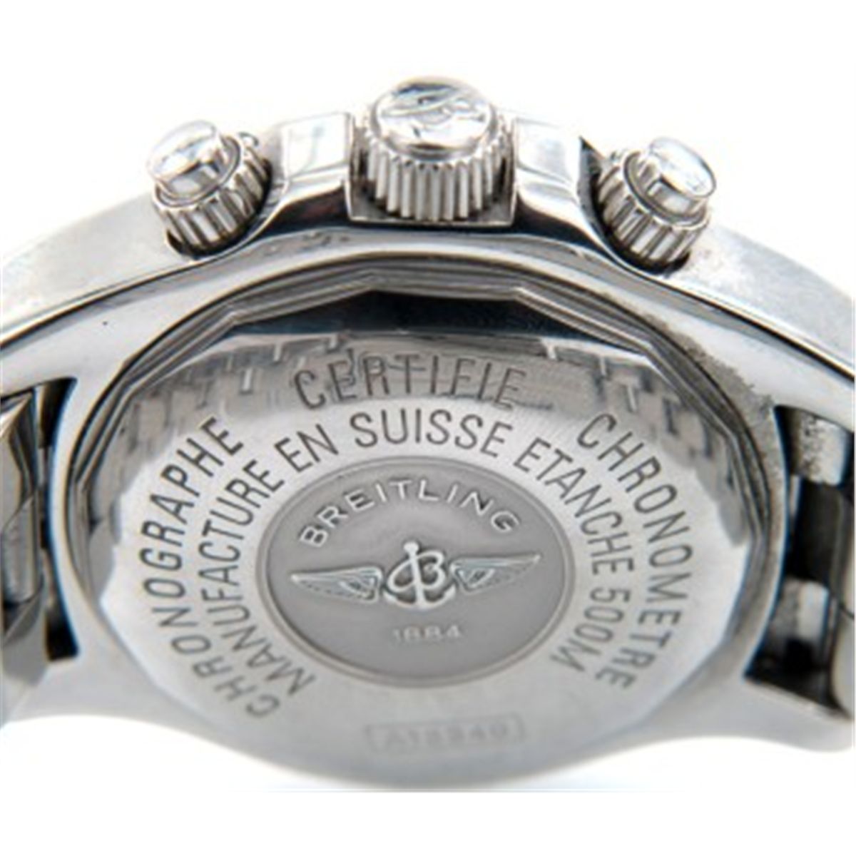 Breitling Chronograph Mens Wristwatch with Original Box.The total watch's weight is 191 grams.The measurements of watch head is 41 x 46 mm and 17 mm thick.The length of watch: 7.25"Case Type: Stainless steel.Automatic, Chronograph.water Resistant.swiss made.Chain is 19 mm wide