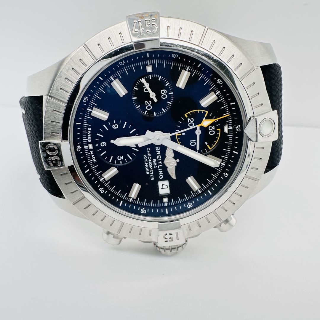 This Breitling Avenger Chronograph is a robust stainless steel timepiece engineered for durability and precision. It features a black dial with luminous hour markers, chronograph subdials, and a date display at 3 o'clock. Water resistant to 300m and fitted with a black textile strap, this certified chronometer embodies Breitling's reputation for rugged performance and aviation-inspired style.