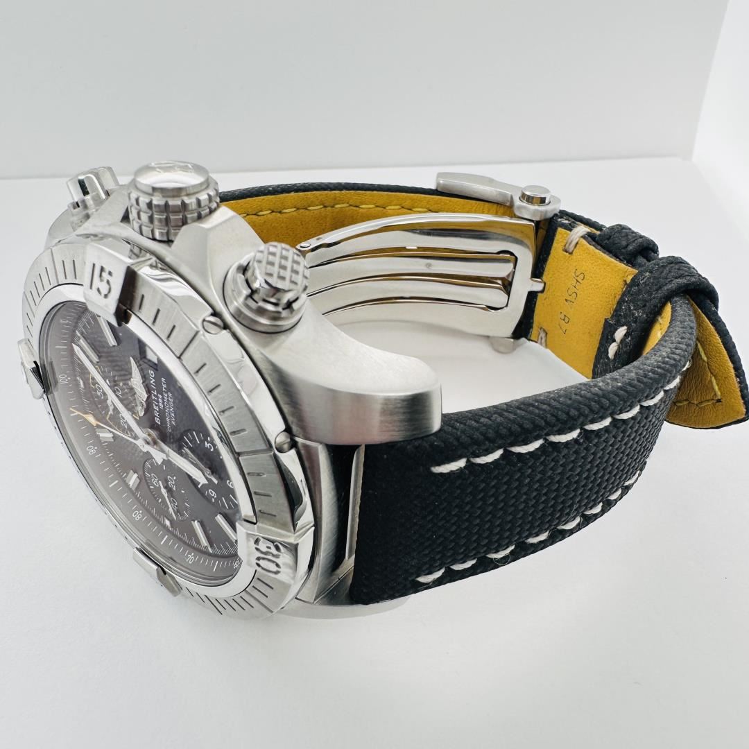This Breitling Avenger Chronograph is a robust stainless steel timepiece engineered for durability and precision. It features a black dial with luminous hour markers, chronograph subdials, and a date display at 3 o'clock. Water resistant to 300m and fitted with a black textile strap, this certified chronometer embodies Breitling's reputation for rugged performance and aviation-inspired style.