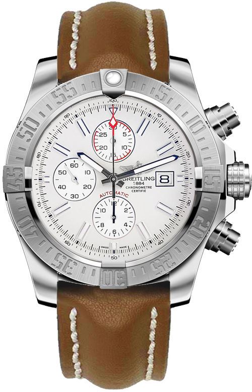Model: A1337111/G779-443X - CASE = [Material:Stainless Steel], [Case Diameter:48], [Bezel:Unidirectional rotating], [Water Resistant:300 Meters - 1000 Feet], [Crystal:Scratch Resistant Sapphire], DIAL = [Color:Silver], MOVEMENT = [Type:Chronograph Automatic Self Winding], [Crown:Screw Down], BAND = [Clasp:Pin & Buckle], [Type:Leather], (In Stock - Ready to ship.)