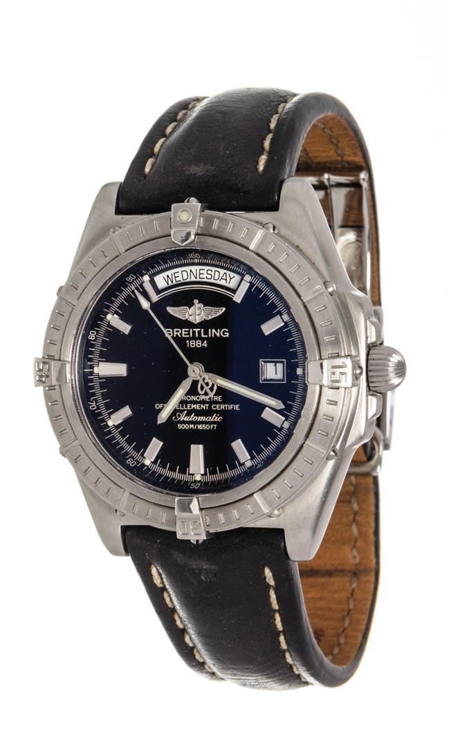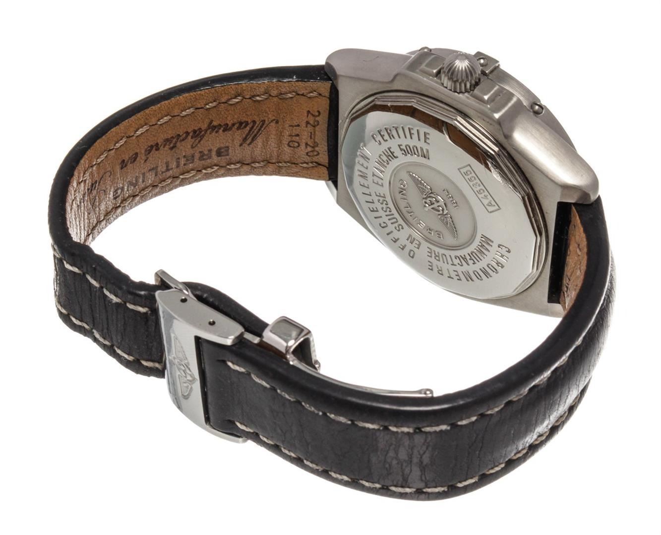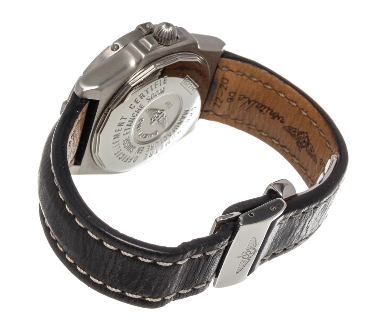 One Breitling Black Leather Chronomet Watch. Item is sold AS-IS. All available information is listed in the description and shown in the photo. Breitling Black Leather Chronomet Watch with leather, silver-tone hardware.