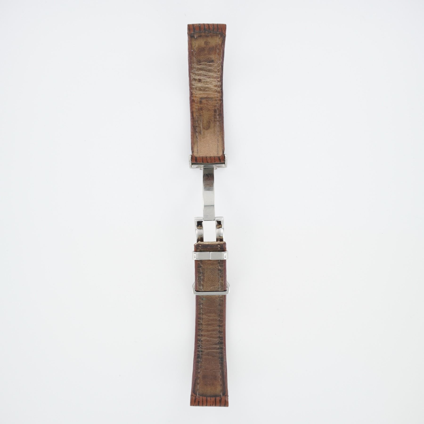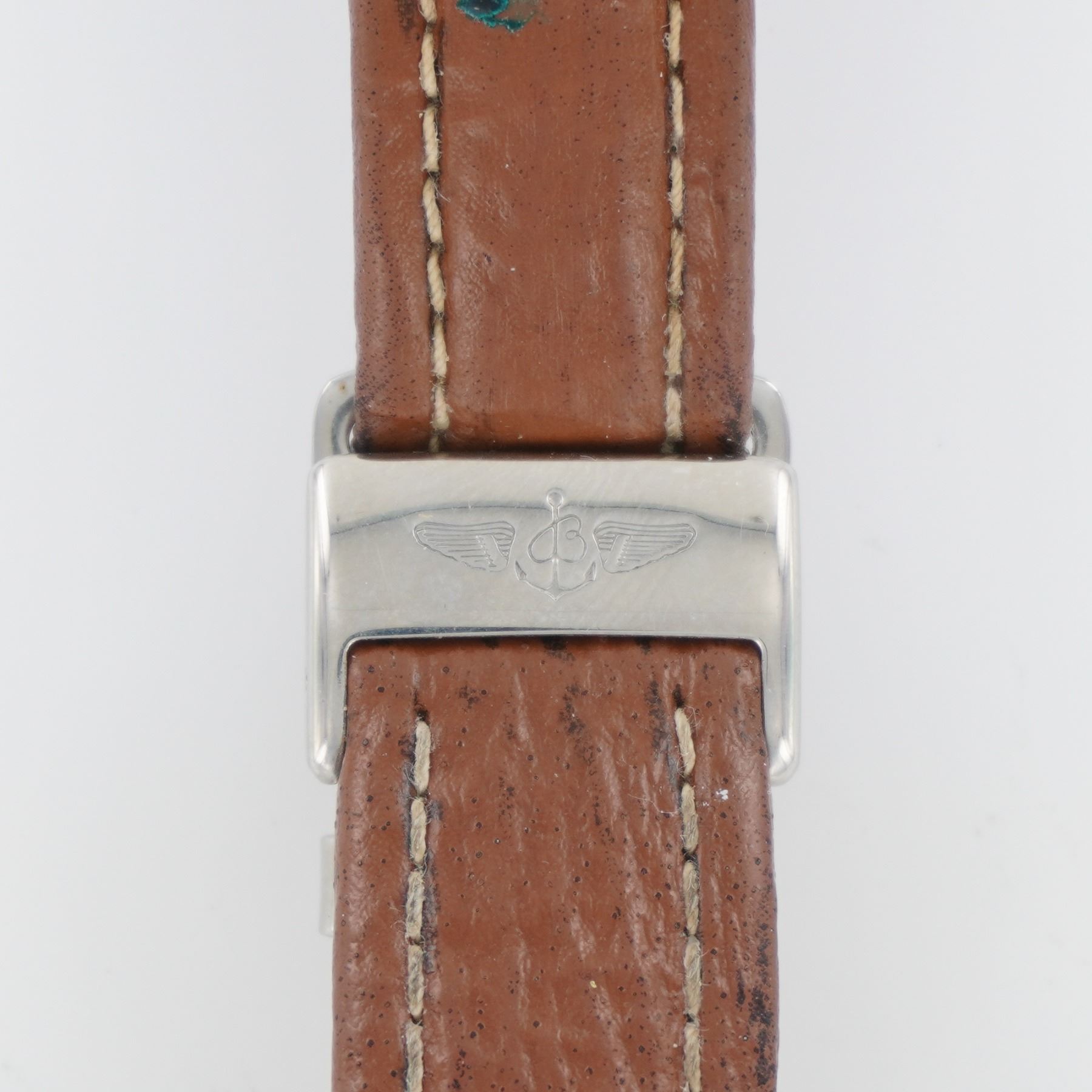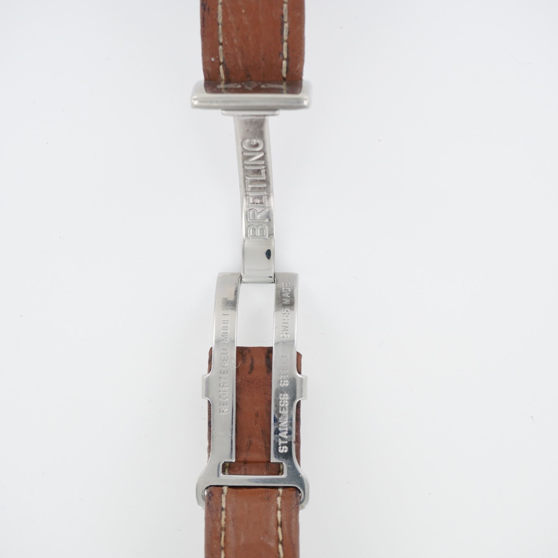 A brown leather example with contrast stitching, fitted with a stainless steel Breitling deployment clasp. The clasp is marked to the interior with Breitling branding and model inscriptions.