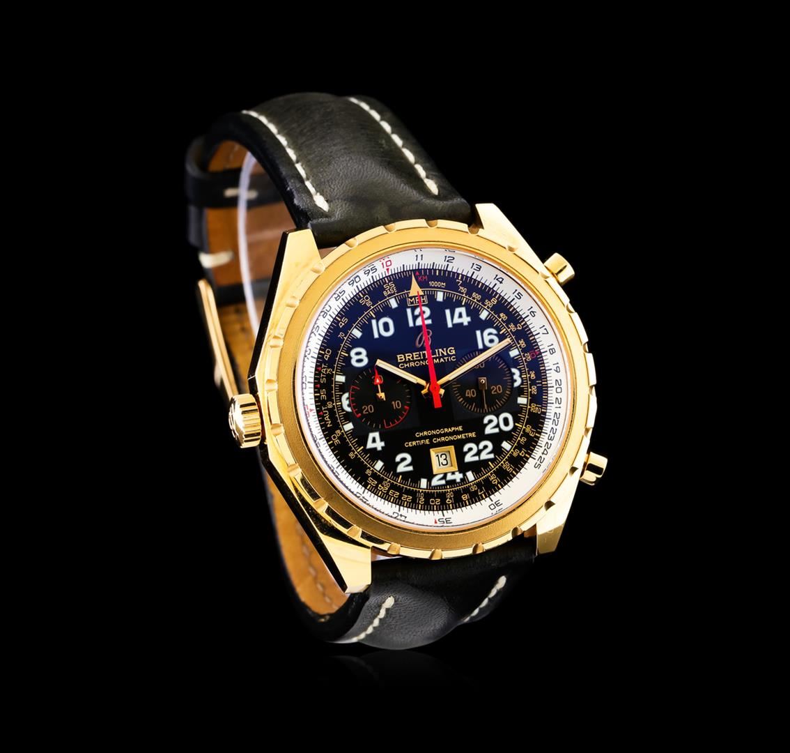 One Breitling Chrono-Matic men's watch featuring: Case: 18KT rose gold, round, 45mm diameter. Dial: black with Arabic numerals. Movement: Automatic. Bezel: 18KT rose gold. Crystal: Sapphire. Bracelet: Black leather with 18KT rose gold buckle. Condition: minor wear on bracelet and back of case, but otherwise in near perfect condition.