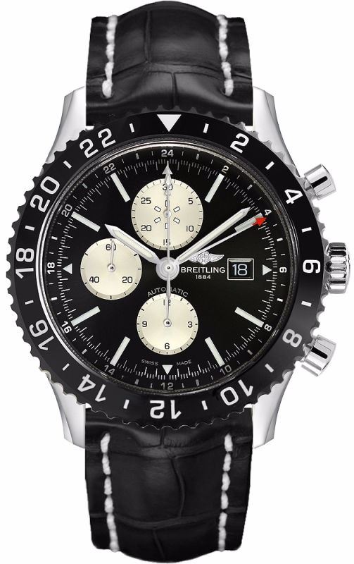 Model: Y2431012/BE10-760P - CASE = [Material:Polished Stainless Steel], [Case Diameter:46], [Case Thickness:16mm], [Bezel:Bi-Directional Rotating], [Case Back:Screw Down], [Water Resistant:101 Meters - 330 Feet], [Crystal:Scratch Resistant Sapphire],; DIAL = [Color:Black with White Subdials],; MOVEMENT = [Type:Self Winding Automatic Chronograph, Date, GMT 2nd Time Zone Feature, 42 Hour Power Reserve, Calibre 25], [Crown:Screw Down],; BAND = [Clasp:Tang], [Type:Black Alligator Leather], (Usually ships in 1 to 2 weeks.)