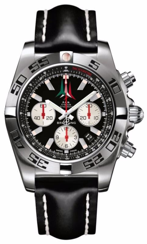 Model: AB01104D/BC62-435X - CASE = [Material:Stainless Steel], [Case Diameter:44], [Case Thickness:16.95mm], [Bezel:Fixed], [Case Back:Solid], [Water Resistant:500 Meters/1650 Feet], [Crystal:Scratch Resistant Sapphire],; DIAL = [Color:Onyx Black with Chronograph],; MOVEMENT = [Type:Automatic Self Winding], [Crown:Screw Down],; BAND = [Clasp:Tang], [Type:Black Calfskin Leather], (In Stock - Ready to ship.)