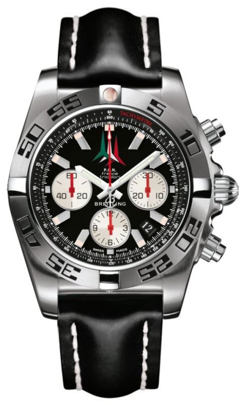 Model: AB01104D/BC62-435X - CASE = [Material:Stainless Steel], [Case Diameter:44], [Case Thickness:16.95mm], [Bezel:Fixed], [Case Back:Solid], [Water Resistant:500 Meters/1650 Feet], [Crystal:Scratch Resistant Sapphire], DIAL = [Color:Onyx Black with Chronograph], MOVEMENT = [Type:Automatic Self Winding], [Crown:Screw Down], BAND = [Clasp:Tang], [Type:Black Calfskin Leather], (In Stock - Ready to ship.)