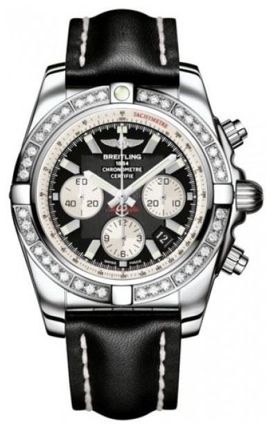 Model: AB011053/B967-LST - CASE = [Material:Stainless Steel], [Case Diameter:43.5], [Case Thickness:17mm], [Bezel:Uni-Directional Rotating with Diamonds], [Case Back:Solid], [Water Resistant:500 Meters/1650 Feet], [Crystal:Scratch Resistant Sapphire], DIAL = [Color:Black Chronograph], MOVEMENT = [Type:Automatic Self Winding Chronograph-Chronometer], [Crown:Screw Down], BAND = [Clasp:Tang], [Type:Black Calfskin Leather], (Usually ships in 1 to 2 weeks.)