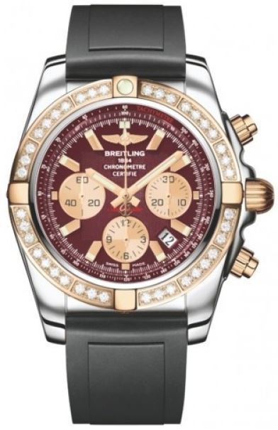 Model: CB011053/K524-DPT - CASE = [Material:Stainless Steel & Gold], [Case Diameter:43.5], [Case Thickness:17mm], [Bezel:Uni-Directional Rotating with Diamonds], [Case Back:Solid], [Water Resistant:500 Meters/1650 Feet], [Crystal:Scratch Resistant Sapphire], DIAL = [Color:Burgundy Chronograph], MOVEMENT = [Type:Automatic Self Winding Chronograph-Chronometer], [Crown:Screw Down], BAND = [Clasp:Tang], [Type:Black Rubber], (Usually ships in 1 to 2 weeks.)