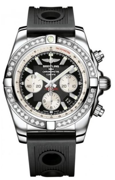 Model: AB011053/B967-ORD - CASE = [Material:Stainless Steel], [Case Diameter:43.5], [Case Thickness:17mm], [Bezel:Uni-Directional Rotating with Diamonds], [Case Back:Solid], [Water Resistant:500 Meters/1650 Feet], [Crystal:Scratch Resistant Sapphire], DIAL = [Color:Black Chronograph], MOVEMENT = [Type:Automatic Self Winding Chronograph-Chronometer], [Crown:Screw Down], BAND = [Clasp:Deployment], [Type:Black Rubber], (Usually ships in 1 to 2 weeks.)