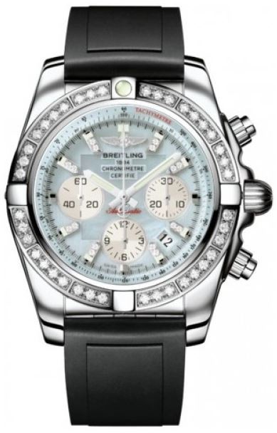 Model: AB011053/G686-DPT - CASE = [Material:Stainless Steel], [Case Diameter:43.5], [Case Thickness:17mm], [Bezel:Uni-Directional Rotating with Diamonds], [Case Back:Solid], [Water Resistant:500 Meters/1650 Feet], [Crystal:Scratch Resistant Sapphire], DIAL = [Color:Mother of Pearl Chronograph], MOVEMENT = [Type:Automatic Self Winding Chronograph-Chronometer], [Crown:Screw Down], BAND = [Clasp:Tang], [Type:Black Rubber], (Usually ships in 1 to 2 weeks.)