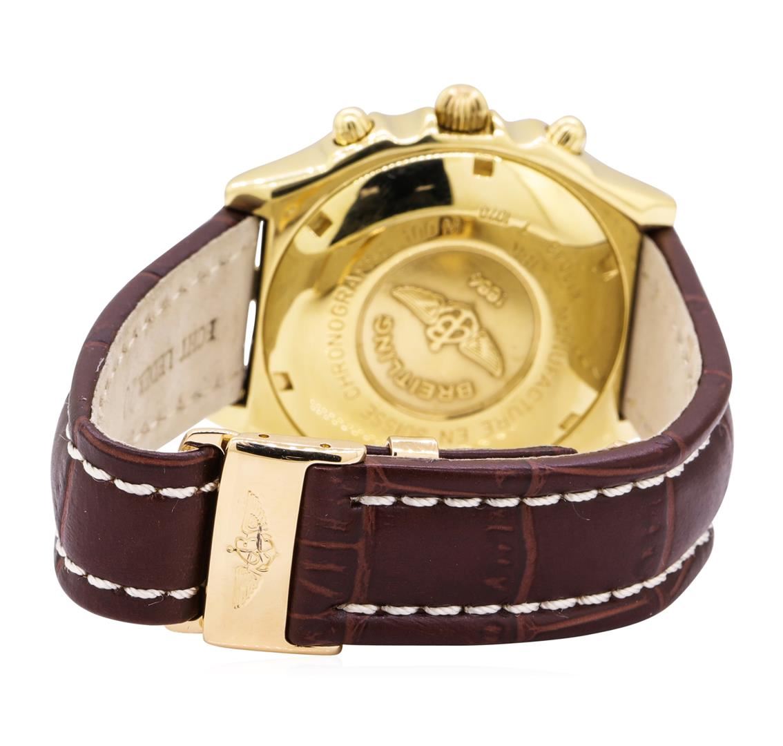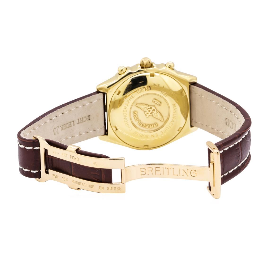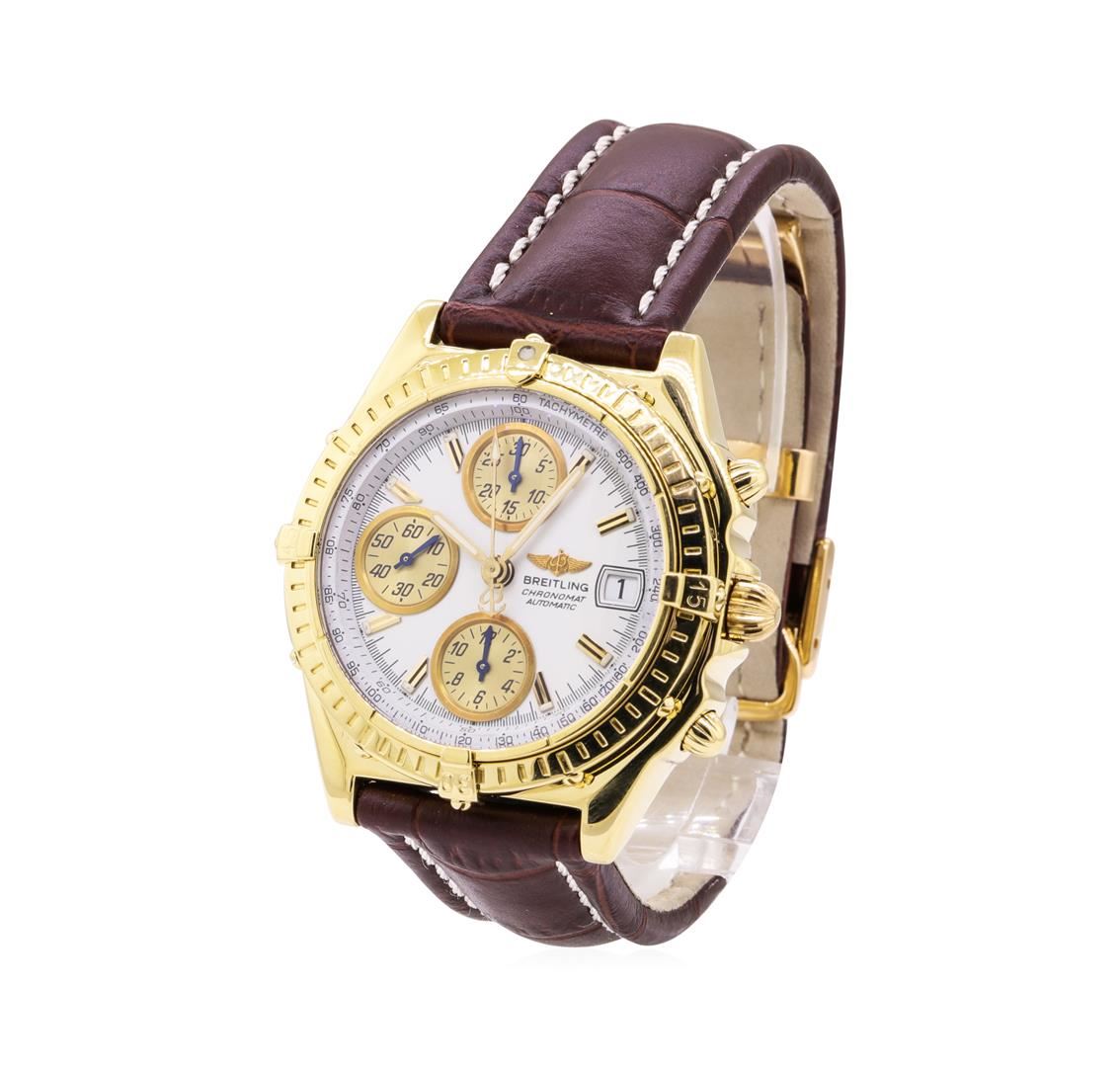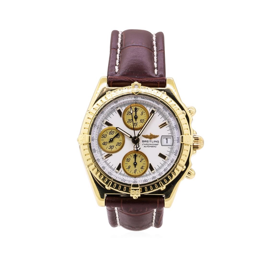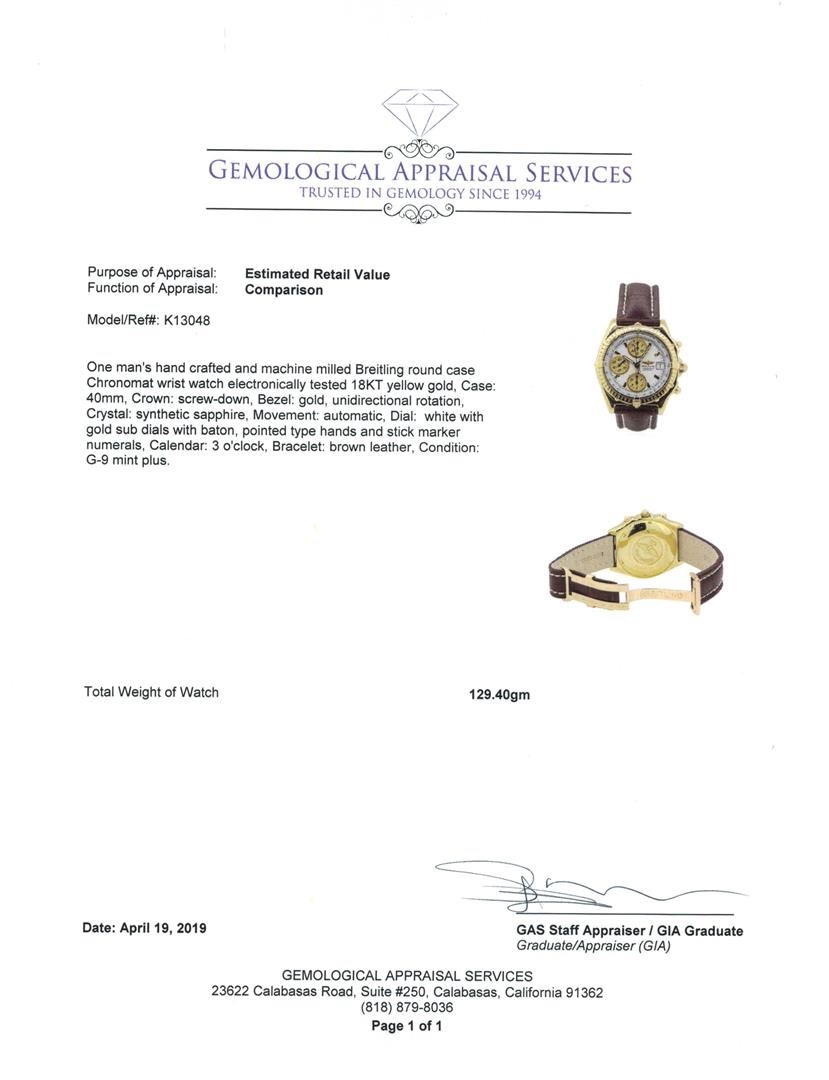 One man's, hand crafted and machine milled Breitling round case Chronomat wrist watch electronically tested 18KT yellow gold, Case: 40mm, Crown: screw-down, Bezel: gold, unidirectional rotation, Crystal: synthetic sapphire, Movement: automatic, Dial: white with gold sub dials with baton, pointed type hands and stick marker numerals, Calendar: 3 o'clock, Bracelet: brown leather, Condition: G-9 mint plus.. Total Weight of Watch 129.40gm GAS Appraised at $8000.00. GAS Appraised at $6,735.00.