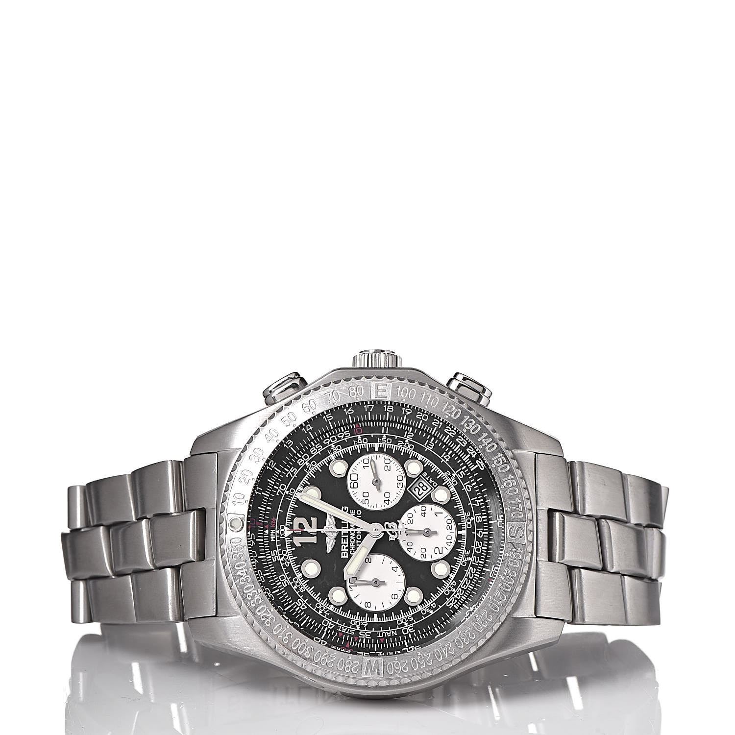 Black watch is crafted of stainless steel and features a black colored dial, three chronograph sub dials, luminescent hour markers and hands, a rotating bezel, and a date display.