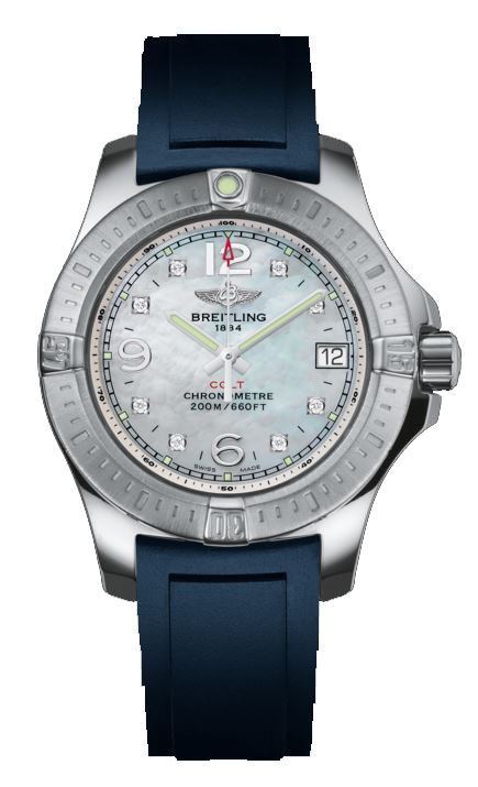 Model: A7738811/A769-141S - CASE = [Material:Stainless steel], [Case Diameter:33], [Case Thickness:9.10mm], [Bezel:Uni-Directional Rotating], [Case Back:Screwed In], [Water Resistant:200 Meters - 660 Feet], [Crystal:Scratch Resistant Sapphire],; DIAL = [Color:Mother of Pearl with Diamonds],; MOVEMENT = [Type:Quartz], [Crown:Screw Down],; BAND = [Clasp:Tang], [Type:Blue Rubber], (Usually ships in 1 to 2 weeks.)