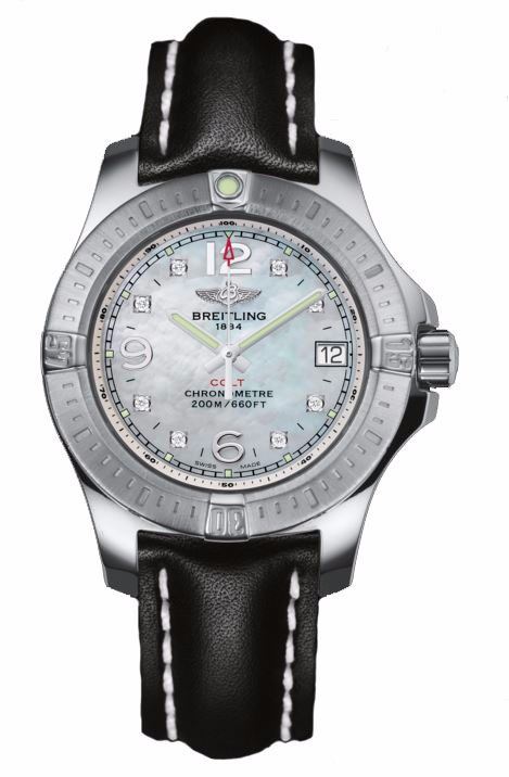 Model: A7738811/A769-408X - CASE = [Material:Stainless steel], [Case Diameter:33], [Case Thickness:9.10mm], [Bezel:Uni-Directional Rotating], [Case Back:Screwed In], [Water Resistant:200 Meters - 660 Feet], [Crystal:Scratch Resistant Sapphire],; DIAL = [Color:Mother of Pearl with Diamonds],; MOVEMENT = [Type:Quartz], [Crown:Screw Down],; BAND = [Clasp:Tang], [Type:Black Calfskin Leather], (Usually ships in 1 to 2 weeks.)