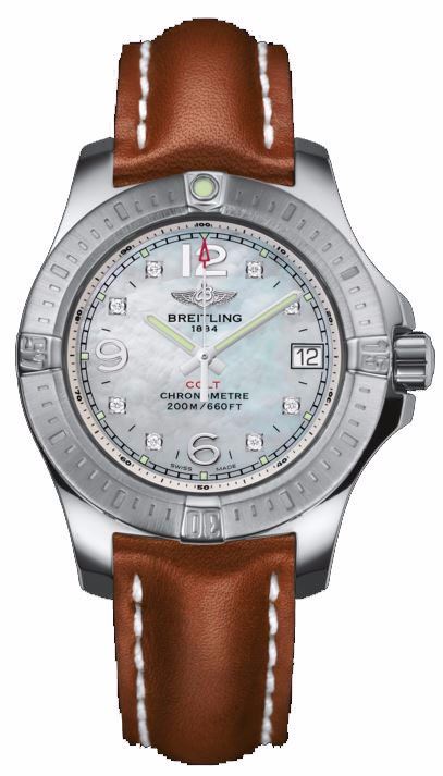 Model: A7738811/A769-406X - CASE = [Material:Stainless steel], [Case Diameter:33], [Case Thickness:9.10mm], [Bezel:Uni-Directional Rotating], [Case Back:Screwed In], [Water Resistant:200 Meters - 660 Feet], [Crystal:Scratch Resistant Sapphire],; DIAL = [Color:Mother of Pearl with Diamonds],; MOVEMENT = [Type:Quartz], [Crown:Screw Down],; BAND = [Clasp:Tang], [Type:Brown Calfskin Leather], (Usually ships in 1 to 2 weeks.)