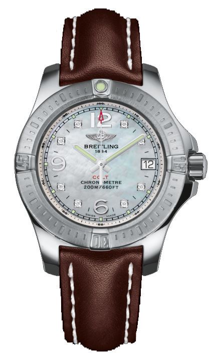 Model: A7738811/A769-411X - CASE = [Material:Stainless steel], [Case Diameter:33], [Case Thickness:9.10mm], [Bezel:Uni-Directional Rotating], [Case Back:Screwed In], [Water Resistant:200 Meters - 660 Feet], [Crystal:Scratch Resistant Sapphire], DIAL = [Color:Mother of Pearl with Diamonds], MOVEMENT = [Type:Quartz], [Crown:Screw Down], BAND = [Clasp:Deployment], [Type:Brown Calfskin Leather], (Usually ships in 1 to 2 weeks.)