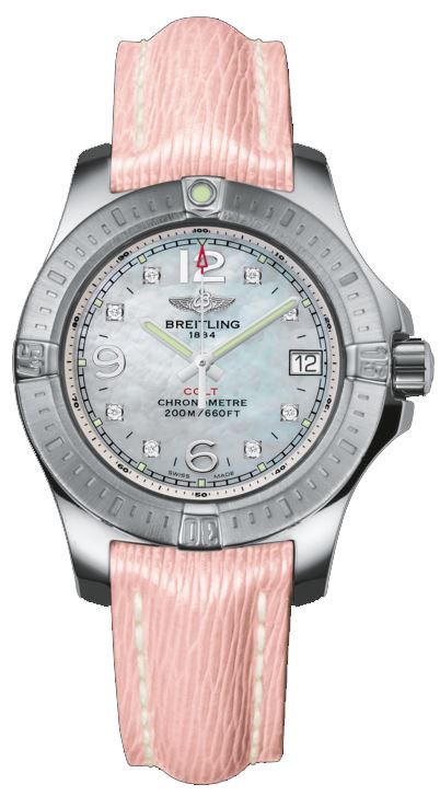 Model: A7738811/A769-238X - CASE = [Material:Stainless steel], [Case Diameter:33], [Case Thickness:9.10mm], [Bezel:Uni-Directional Rotating], [Case Back:Screwed In], [Water Resistant:200 Meters - 660 Feet], [Crystal:Scratch Resistant Sapphire], DIAL = [Color:Mother of Pearl with Diamonds], MOVEMENT = [Type:Quartz], [Crown:Screw Down], BAND = [Clasp:Tang], [Type:Pink Leather], (Usually ships in 1 to 2 weeks.)