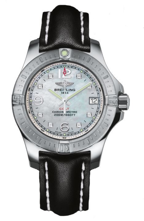 Model: A7738811/A769-409X - CASE = [Material:Stainless steel], [Case Diameter:33], [Case Thickness:9.10mm], [Bezel:Uni-Directional Rotating], [Case Back:Screwed In], [Water Resistant:200 Meters - 660 Feet], [Crystal:Scratch Resistant Sapphire], DIAL = [Color:Mother of Pearl with Diamonds], MOVEMENT = [Type:Quartz], [Crown:Screw Down], BAND = [Clasp:Deployment], [Type:Black Calfskin Leather], (Usually ships in 1 to 2 weeks.)