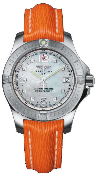 Model: A7738811/A769-212X - CASE = [Material:Stainless steel], [Case Diameter:33], [Case Thickness:9.10mm], [Bezel:Uni-Directional Rotating], [Case Back:Screwed In], [Water Resistant:200 Meters - 660 Feet], [Crystal:Scratch Resistant Sapphire], DIAL = [Color:Mother of Pearl with Diamonds], MOVEMENT = [Type:Quartz], [Crown:Screw Down], BAND = [Clasp:Tang], [Type:Orange Leather], (Usually ships in 1 to 2 weeks.)