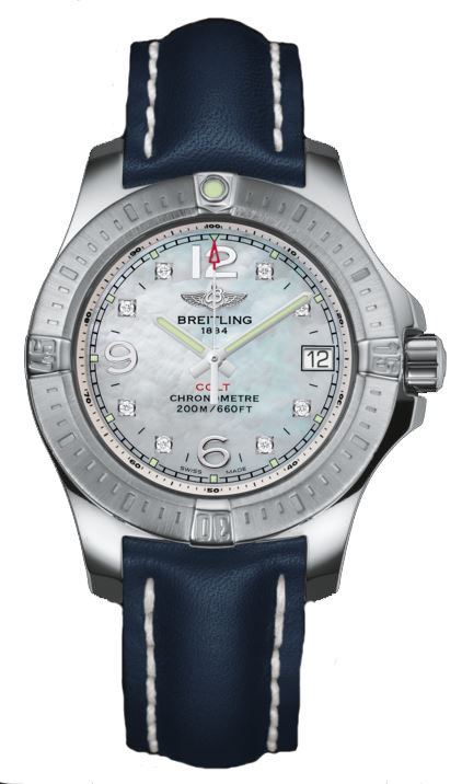 Model: A7738811/A769-116X - CASE = [Material:Stainless steel], [Case Diameter:33], [Case Thickness:9.10mm], [Bezel:Uni-Directional Rotating], [Case Back:Screwed In], [Water Resistant:200 Meters - 660 Feet], [Crystal:Scratch Resistant Sapphire], DIAL = [Color:Mother of Pearl with Diamonds], MOVEMENT = [Type:Quartz], [Crown:Screw Down], BAND = [Clasp:Tang], [Type:Blue Calfskin Leather], (Usually ships in 1 to 2 weeks.)