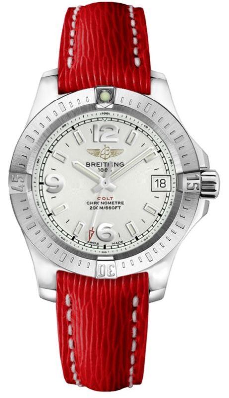 Model: A7438911/G803-214X - CASE = [Material:Stainless Steel], [Case Diameter:36], [Case Thickness:10.2mm], [Bezel:Uni-Directional Rotating], [Case Back:Solid], [Water Resistant:200 Meters - 660 feet], [Crystal:Scratch Resistant Sapphire], DIAL = [Color:Silver], MOVEMENT = [Type:Quartz], [Crown:Screw Down], BAND = [Clasp:Tang], [Type:Red Leather], (Usually ships in 1 to 2 weeks.)