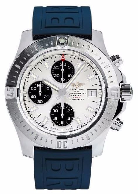 Model: A1338811/G804-158S - CASE = [Material:Stainless Steel], [Case Diameter:44], [Bezel:Uni-Directional Rotating], [Case Back:Screw Down], [Water Resistant:200 Meters/660 Feet], [Crystal:Scratch Resistant Sapphire],; DIAL = [Color:White],; MOVEMENT = [Type:Self Winding Automatic Chronograph], [Crown:Screw Down],; BAND = [Clasp:Tang], [Type:Blue DPT3 w/ Breitling on Strap], (Usually ships in 2 to 4 weeks.)