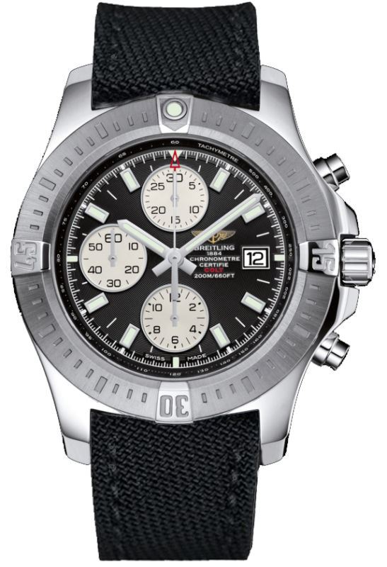 Model: A1338811/BD83-103W - CASE = [Material:Stainless Steel], [Case Diameter:44], [Bezel:Uni-Directional Rotating], [Case Back:Screw Down], [Water Resistant:200 Meters/660 Feet], [Crystal:Scratch Resistant Sapphire], DIAL = [Color:Black], MOVEMENT = [Type:Self Winding Automatic Chronograph], [Crown:Screw Down], BAND = [Clasp:Tang], [Type:Black Canvas], (Usually ships in 2 to 4 weeks.)