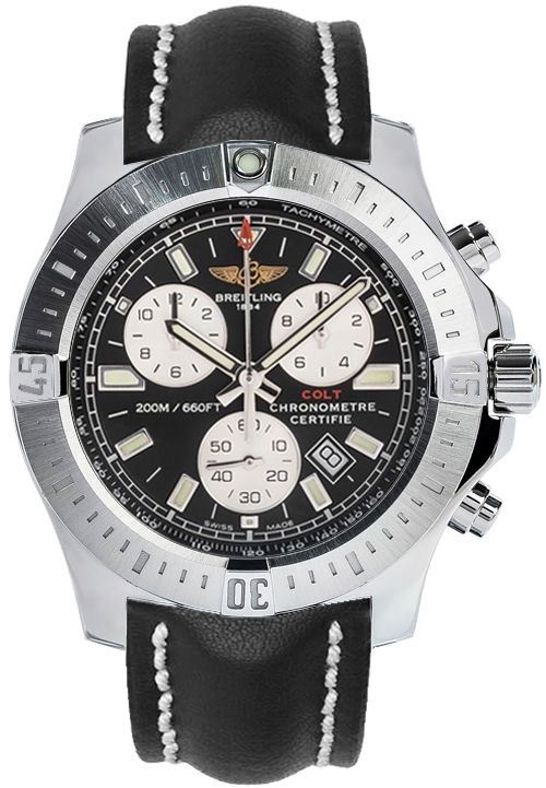 Model: A7338811/BD43-435X - CASE = [Material:Stainless Steel], [Case Diameter:44], [Bezel:Unidirectional rotating], [Case Back:Screw in], [Water Resistant:200 Meters - 660 Feet], [Crystal:Scratch Resistant Sapphire],; DIAL = [Color:Black],; MOVEMENT = [Type:Chronograph Battery Powered Quartz], [Crown:Screw Down],; BAND = [Clasp:Pin & Buckle], [Type:Leather], (In Stock - Ready to ship.)