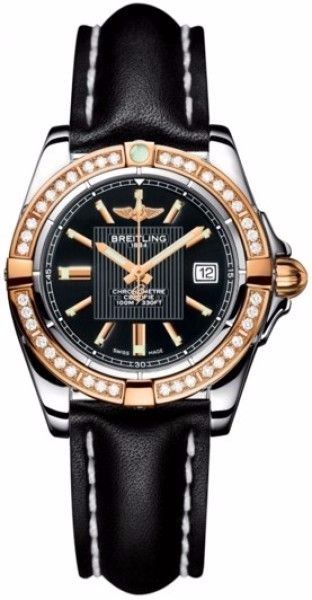 Model: C71356LA/BA12-LST - CASE = [Material:Polished Stainless Steel and Rose Gold], [Case Diameter:31.8], [Case Thickness:12.70mm], [Bezel:Uni-Directional Rotating with Diamonds], [Case Back:Solid], [Water Resistant:100 Meters/330 Feet], [Crystal:Scratch Resistant Sapphire],; DIAL = [Color:Trophy Black],; MOVEMENT = [Type:Battery Powered Quartz-Chronometer],; BAND = [Clasp:Tang], [Type:Black Calfskin Leather], (Usually ships in 1 to 2 weeks.)