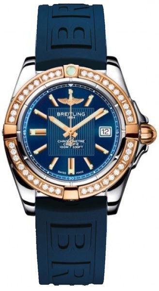 Model: C71356LA/C813-DPT - CASE = [Material:Polished Stainless Steel and Rose Gold], [Case Diameter:31.8], [Case Thickness:12.70mm], [Bezel:Uni-Directional Rotating with Diamonds], [Case Back:Solid], [Water Resistant:100 Meters/330 Feet], [Crystal:Scratch Resistant Sapphire], DIAL = [Color:Metallica Blue], MOVEMENT = [Type:Battery Powered Quartz-Chronometer], BAND = [Clasp:Tang], [Type:Blue Rubber], (Usually ships in 1 to 2 weeks.)