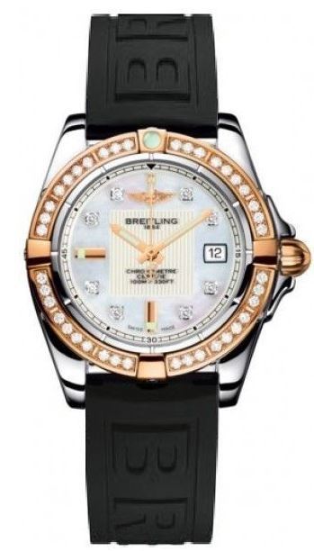Model: C71356LA/A712-133S - CASE = [Material:Polished Stainless Steel and Rose Gold], [Case Diameter:31.8], [Case Thickness:12.70mm], [Bezel:Uni-Directional Rotating with Diamonds], [Case Back:Solid], [Water Resistant:100 Meters/330 Feet], [Crystal:Scratch Resistant Sapphire], DIAL = [Color:Mother of Pearl], MOVEMENT = [Type:Battery Powered Quartz-Chronometer], BAND = [Clasp:Tang], [Type:Black Rubber], (Usually ships in 1 to 2 weeks.)