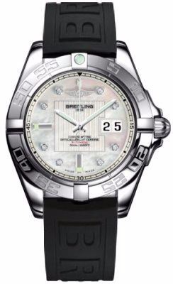 Model: A49350L2/A702-DPT - CASE = [Material:Polished Stainless Steel], [Case Diameter:41], [Case Thickness:14mm], [Bezel:Uni-Directional Rotating], [Case Back:Solid], [Water Resistant:300 Meters / 1000 Feet], [Crystal:Scratch Resistant Sapphire],; DIAL = [Color:White Mother of Pearl with 8 Diamond Hour Markers and Large Double Date at 3],; MOVEMENT = [Type:Automatic Self Winding Chronometer], [Crown:Screw Down],; BAND = [Clasp:Tang Buckle], [Type:Black Diver Pro ll Rubber], (Usually ships in 1 to 2 weeks.)