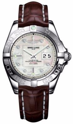 Model: A49350L2/A702-CROCD - CASE = [Material:Polished Stainless Steel], [Case Diameter:41], [Case Thickness:14mm], [Bezel:Uni-Directional Rotating], [Case Back:Solid], [Water Resistant:300 Meters / 1000 Feet], [Crystal:Scratch Resistant Sapphire],; DIAL = [Color:White Mother of Pearl with 8 Diamond Hour Markers and Large Double Date at 3],; MOVEMENT = [Type:Automatic Self Winding Chronometer], [Crown:Screw Down],; BAND = [Clasp:Deployment Buckle (also available with tang buckle)], [Type:Brown Crocodile Leather], (Usually ships in 1 to 2 weeks.)