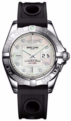 Model: A49350L2/A702-ORD - CASE = [Material:Polished Stainless Steel], [Case Diameter:41], [Case Thickness:14mm], [Bezel:Uni-Directional Rotating], [Case Back:Solid], [Water Resistant:300 Meters / 1000 Feet], [Crystal:Scratch Resistant Sapphire],; DIAL = [Color:White Mother of Pearl with 8 Diamond Hour Markers and Large Double Date at 3],; MOVEMENT = [Type:Automatic Self Winding Chronometer], [Crown:Screw Down],; BAND = [Clasp:Deployment Buckle], [Type:Black Ocean Racer Rubber], (Usually ships in 1 to 2 weeks.)