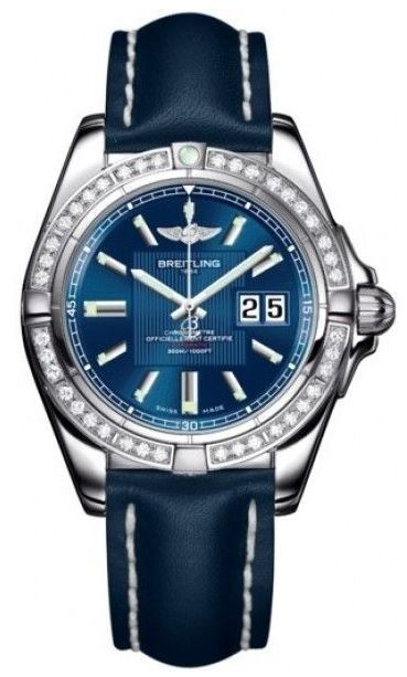 Model: A49350LA/C806-113X - CASE = [Material:Stainless Steel], [Case Diameter:41], [Case Thickness:14mm], [Bezel:Uni-Directional Rotating with Diamonds], [Case Back:Solid], [Water Resistant:300 Meters/1000 Feet], [Crystal:Scratch Resistant Sapphire], DIAL = [Color:Metallica Blue], MOVEMENT = [Type:Automatic Self Winding-Chronometer], BAND = [Clasp:Tang], [Type:Blue Calfskin Leather], (Usually ships in 1 to 2 weeks.)