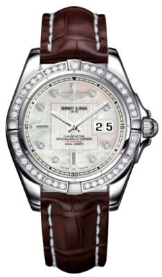Model: A49350LA/A702-CROCD - CASE = [Material:Polished Stainless Steel], [Case Diameter:41], [Case Thickness:14mm], [Bezel:Set with 40 Diamonds, Uni-Directional Rotating], [Case Back:Solid], [Water Resistant:300 Meters / 1000 Feet], [Crystal:Scratch Resistant Sapphire], DIAL = [Color:Mother of Pearl with 8 Diamond Hour Markers and Large Double Date at 3], MOVEMENT = [Type:Automatic Self Winding Chronometer], [Crown:Screw Down], BAND = [Clasp:Deployment Buckle (also available with tang buckle)], [Type:Brown Crocodile Leather], (Usually ships in 1 to 2 weeks.)