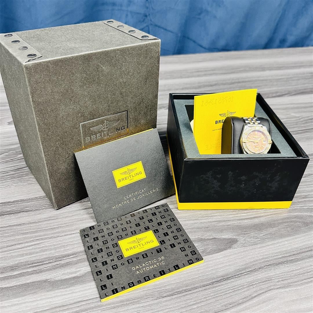 Breitling Galactic factory diamonds, 36mm two tone rose gold and Steel. Beautiful Breitling watch includes factory diamonds and two tone rose gold bracelet. 100% authentic and ready to wear and enjoy!