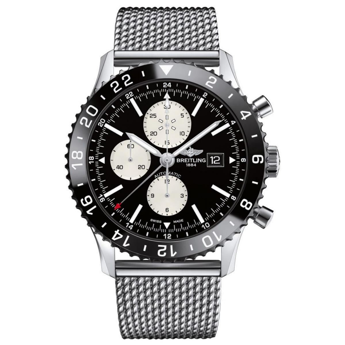 Stainless steel case, Stainless steel bracelet, Black dial, Automatic movement, Scratch resistant Sapphire, Water resistant up to 10 ATM - 100 meters - 330 feet. Brand Name: Breitling. Collection: Chronoliner. Gender: Men. Model: Y2431012/BE10. Dial: Black. Movement: Automatic. Clasp: Fold over. Strap or Bracelet: Bracelet. Strap or Bracelet Color: Silver. Case Shape: Round. Measurement: 46mm. Bracelet Measurement: 22mm. Bracelet Length (in inches): 7. Crystal: Sapphire. Crown: Push/pull. Country of Origin: Switzerland. Water Resistance: 10 ATM - 100 meters - 330 feet. Specifications: Chronograph, Date display.