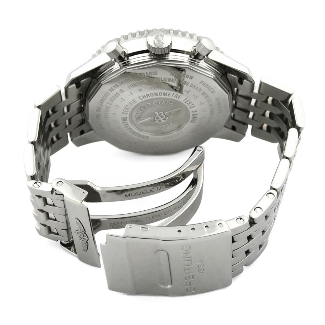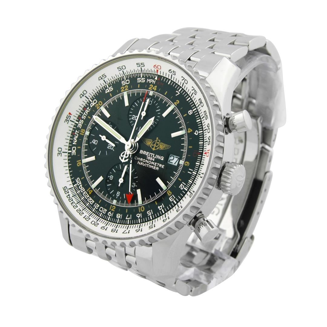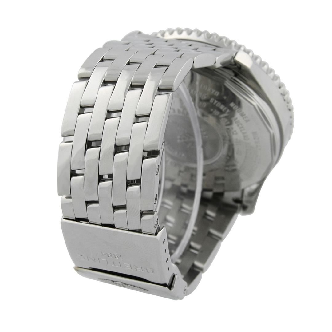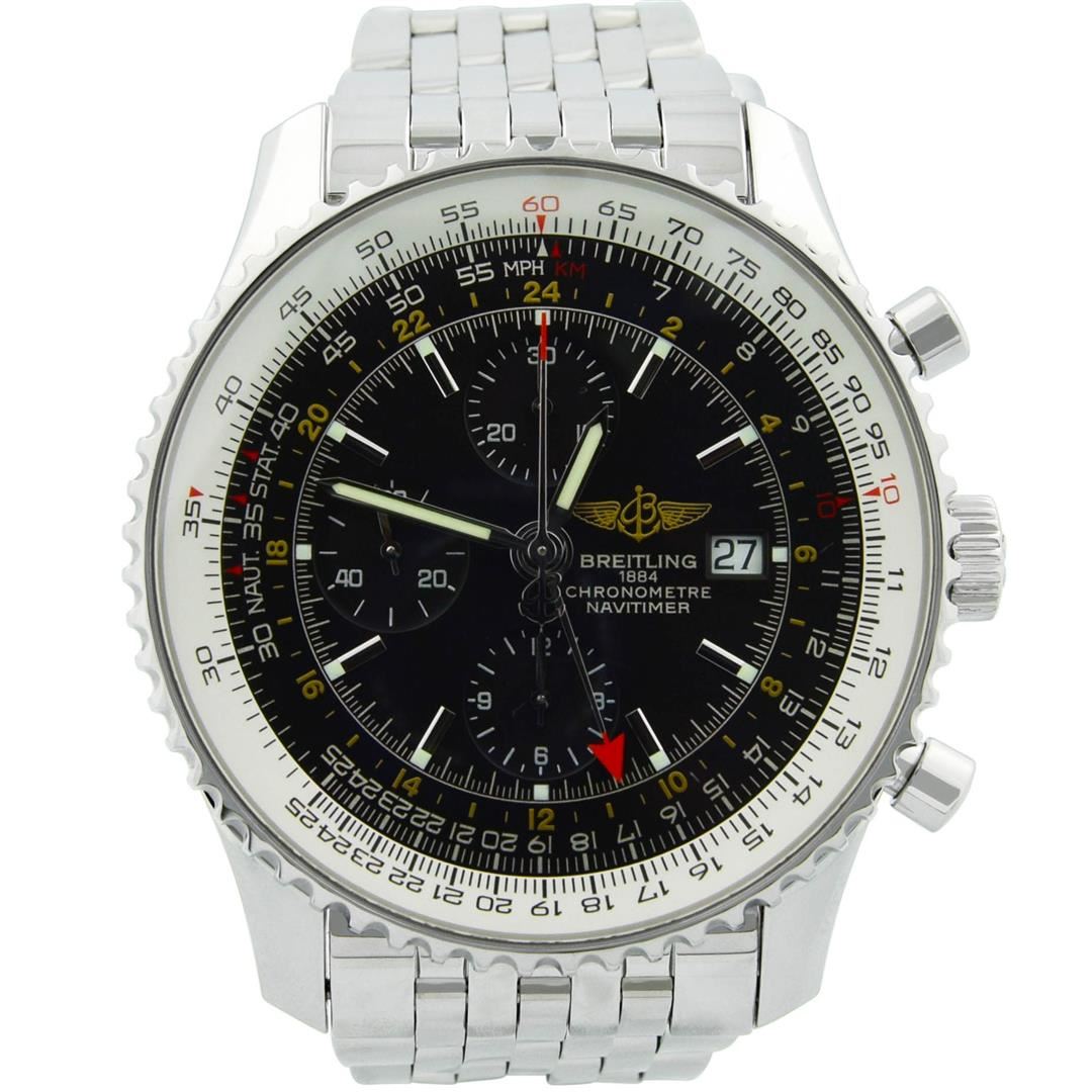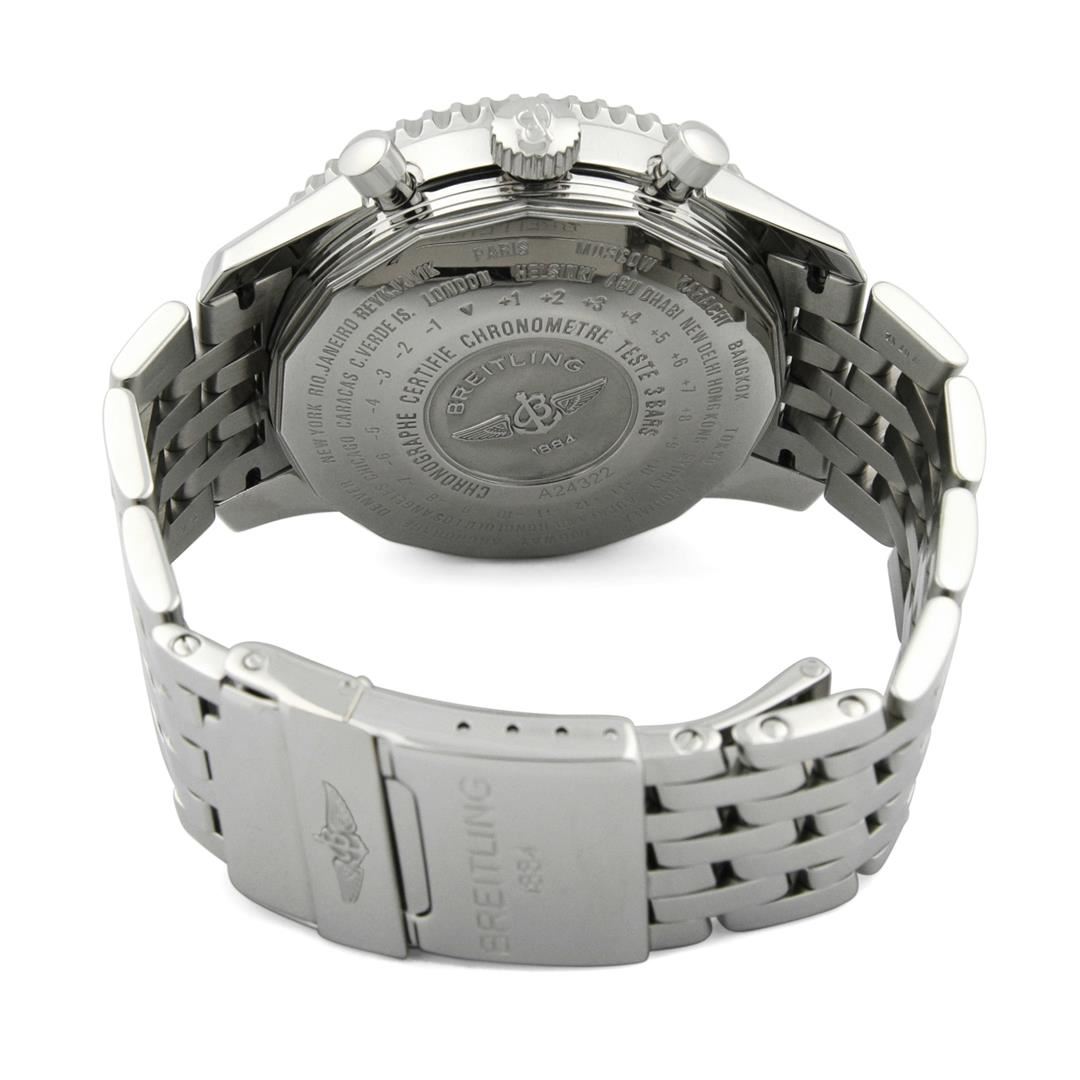 Breitling Navitimer World Mens 46mm Black Dial Steel Polished & Electronically Tested. Model: Navitimer World A24322. Case: Stainless Steel. Crystal: Sapphire. Bracelet: Stainless Steel, Adjustable Standard Clasp. Dial: Original Black. Date Window: 3 O'clock Position date display. Movement: Automatic. Water Resistant: Yes. Case Size: 46mm. Condition: Pre Owned, Minor Scratches on Glass, Extra Fine G-6.