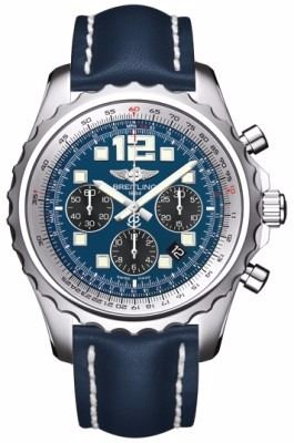 Model: A2336035/C833-LS - CASE = [Material:Stainless Steel], [Case Diameter:46], [Case Thickness:16mm], [Bezel:Bi-Directional Rotating], [Case Back:Solid], [Water Resistant:200 Meters/660 Feet], [Crystal:Scratch Resistant Sapphire],; DIAL = [Color:Gun Blue with Black Sub-Dial Chronograph, Luminescent Hands and Markers, Date Between 4 and 5],; MOVEMENT = [Type:Automatic Self Winding Breitling Calibre 23, Approx. 42hr Power Reserve],; BAND = [Clasp:Tang Buckle (also available with deployment buckle)], [Type:Blue Calfskin Leather], (Usually ships in 2 to 4 weeks.)