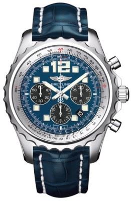 Model: A2336035/C833-CROC - Case,; MATERIALSTAINLESS STEEL = [Case Diameter46], [Case Thickness16mm], [BezelBi-Directional Rotating], [Case BackSolid], [Water Resistant200 Meters/660 Feet], [CrystalScratch Resistant Sapphire], Dial,; COLORGUN BLUE WITH BLACK SUB-DIAL CHRONOGRAPH, LUMINESCENT HANDS AND MARKERS, DATE BETWEEN 4 AND 5 = Movement,; TYPEAUTOMATIC SELF WINDING BREITLING CALIBRE 23, APPROX. 42HR POWER RESERVE = Band,; CLASPDEPLOYMENT BUCKLE (ALSO AVAILABLE WITH TANG BUCKLE) = [TypeCrocodile Blue Leather], (Usually ships in 2 to 4 weeks.)