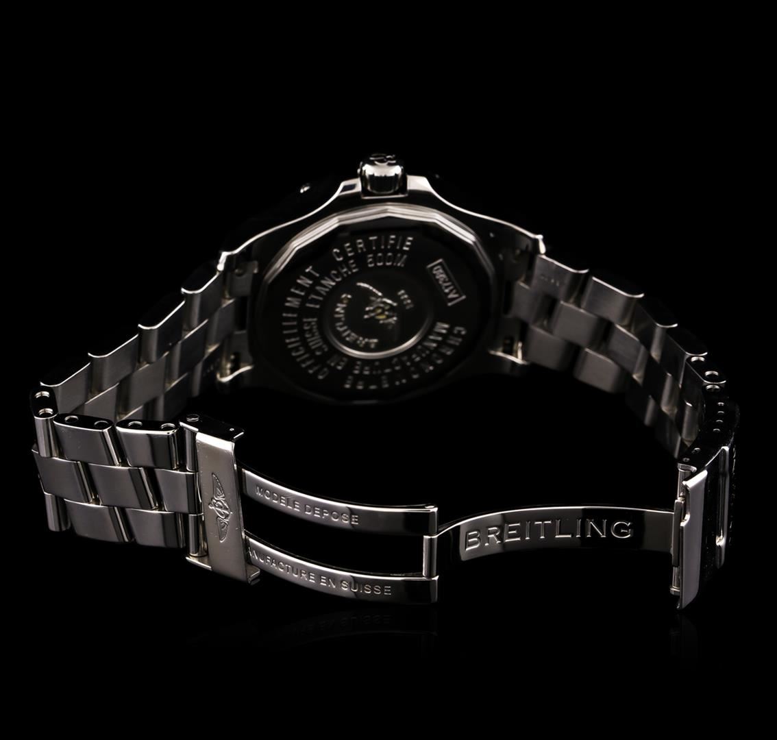 One gents, Breitling Colt wristwatch electronically tested Stainless Steel, Case: 41mm diameter, Case Back: engrave in high relief the Breitling Logo, additional manufacturers information, model and serial number, Water Resistant: 500 meters / 1640 feet, Logo'd Crown: locking, set within protective shoulders, Bezel: uni-directional with four stations, engraved with indices and numerals, Crystal: glare resistant synthetic sapphire. Movement: Breitling 17, Automatic Certified Chronometre, Dial: Black color, with luminous baton pointed hands, and indices, three o'clock position date display window, Power Reserve: 42 Hours, Bracelet: stainless steel Professional II, Seven and one half inch length, adjustable. Breitling flip lock clasp, with logo. Condition: G-6 Extra Fine. Total Weight of Wristwatch 164.62gm. AIG Appraised at $3,220.00.