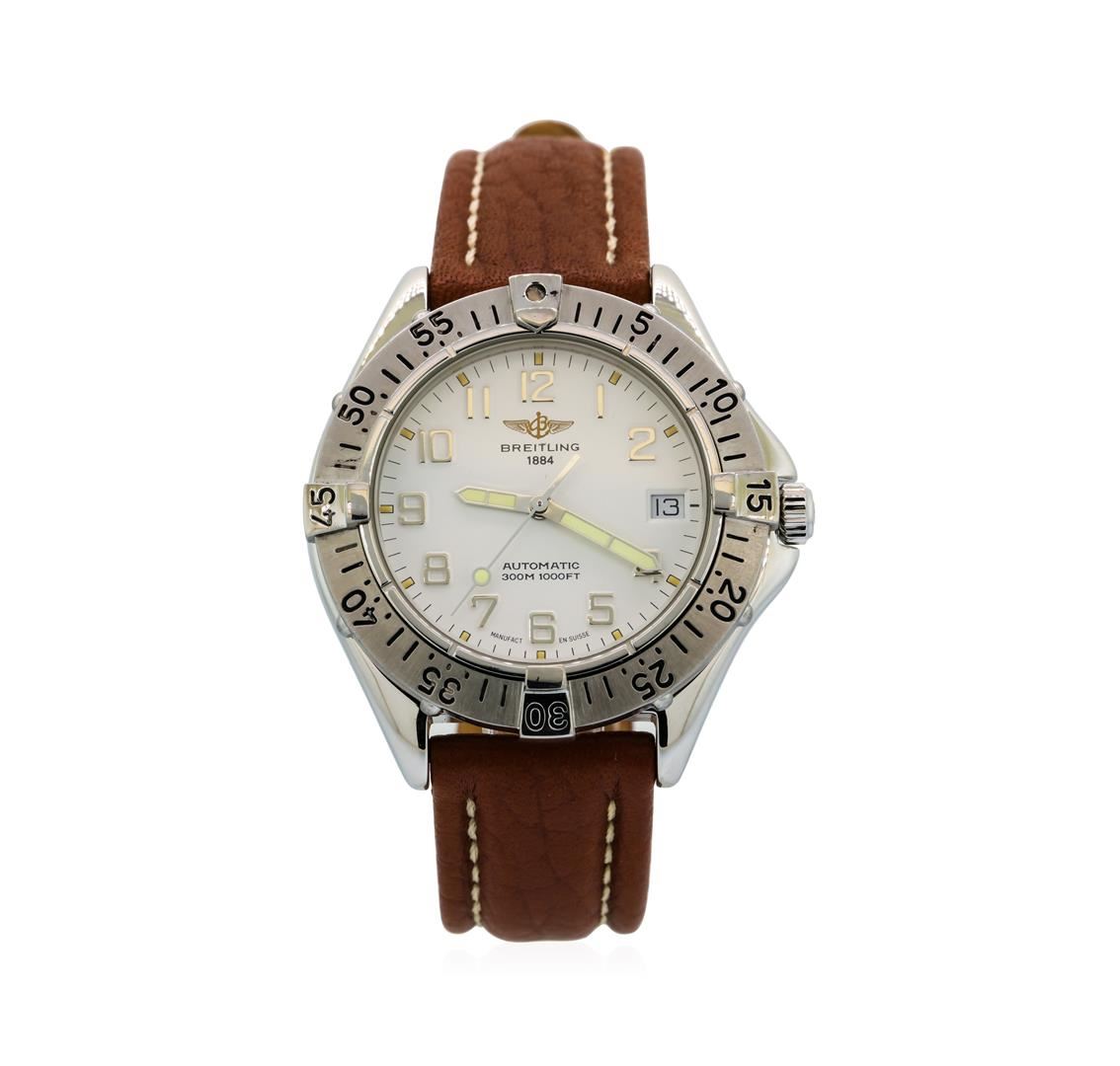 One Breitling wristwatch the Colt Automatic electronically tested Stainless Steel, Case: 38mm diameter, Case Back: engraved with the manufacturer's name, information, and ID numbers, Water Resistant: 300 meters / 1000 feet. Bright polish finish. Bezel: uni-directional, engraved with indices and numerals separated by four raised stations engraved with numerals, Logo'd Crown: set within protective shoulders, Crystal: synthetic sapphire.Breitling Movement: 17, ETA 2824-2, Automatic, with a 42 hour power reserve, Dial: White color, with luminous baton pointed hands & numerals, Date Window: three o'clock position date display, Bracelet: Brown color, saddle stitched leather strap, Eight inch length, adjustable. Condition: G-5 Fine. Total Weight of Wristwatch 67.97gm. AIG Appraised at $2,880.00.