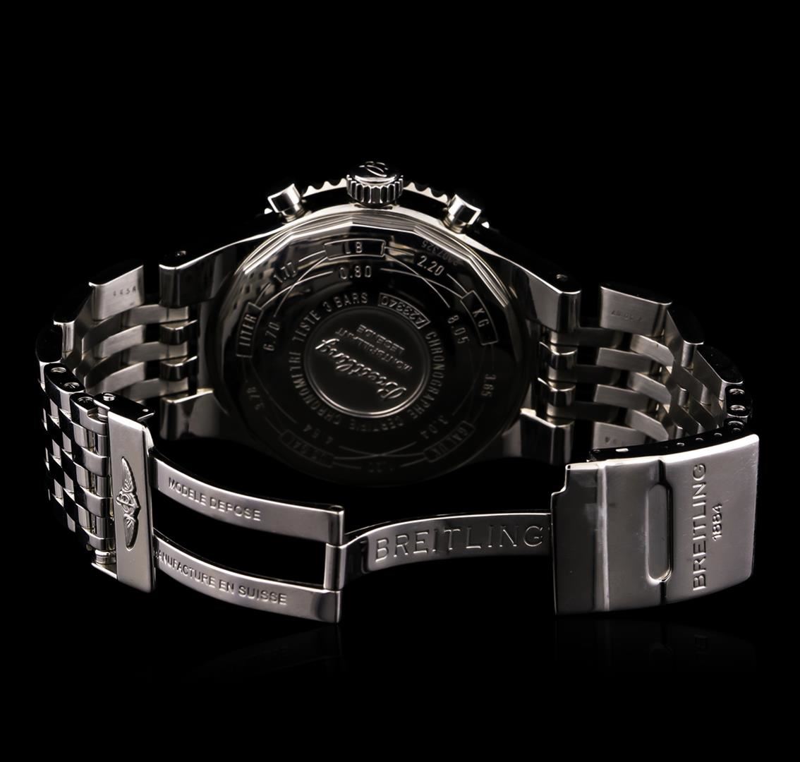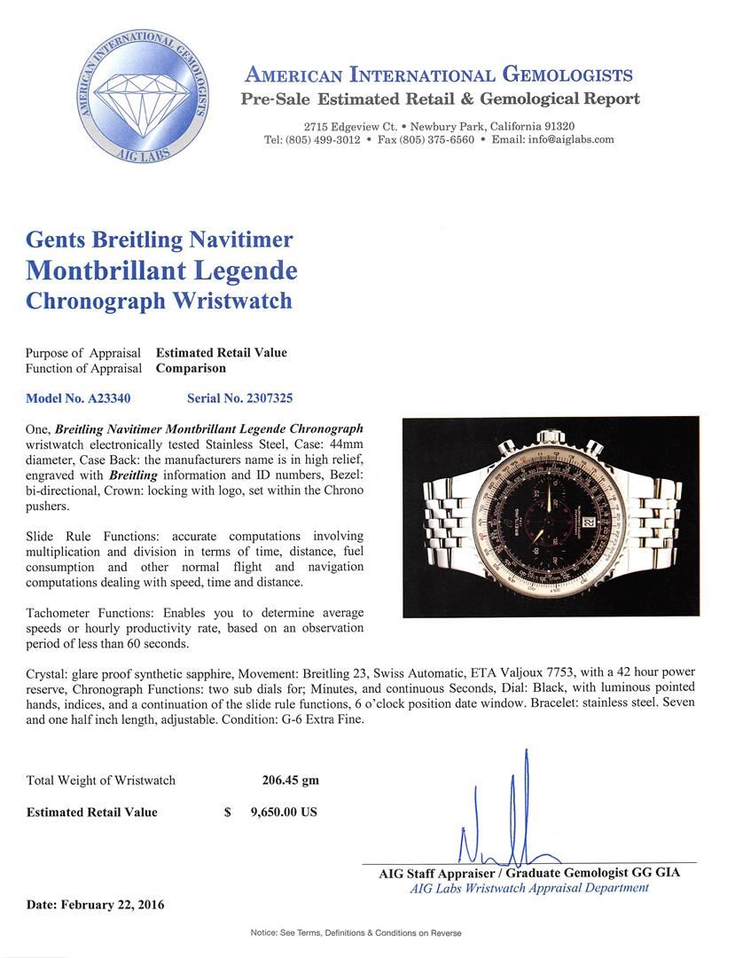 One, Breitling Navitimer Montbrillant Legende Chronograph wristwatch electronically tested Stainless Steel, Case: 44mm diameter, Case Back: the manufacturers name is in high relief, engraved with Breitling information and ID numbers, Bezel: bi-directional, Crown: locking with logo, set within the Chrono pushers. Slide Rule Functions: accurate computations involving multiplication and division in terms of time, distance, fuel consumption and other normal flight and navigation computations dealing with speed, time and distance. Tachometer Functions: Enables you to determine average speeds or hourly productivity rate, based on an observation period of less than 60 seconds. Crystal: glare proof synthetic sapphire, Movement: Breitling 23, Swiss Automatic, ETA Valjoux 7753, with a 42 hour power reserve, Chronograph Functions: two sub dials for; Minutes, and continuous Seconds, Dial: Black, with luminous pointed hands, indices, and a continuation of the slide rule functions, 6 o'clock position date window. Bracelet: stainless steel. Seven and one half inch length, adjustable. Condition: G-6 Extra Fine. Total Weight of Wristwatch 206.45gm. AIG Appraised at $9,650.00.