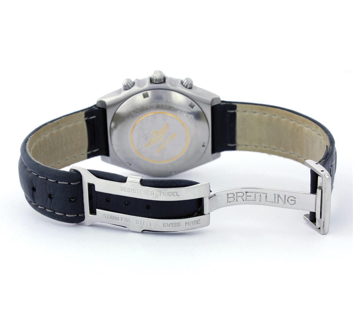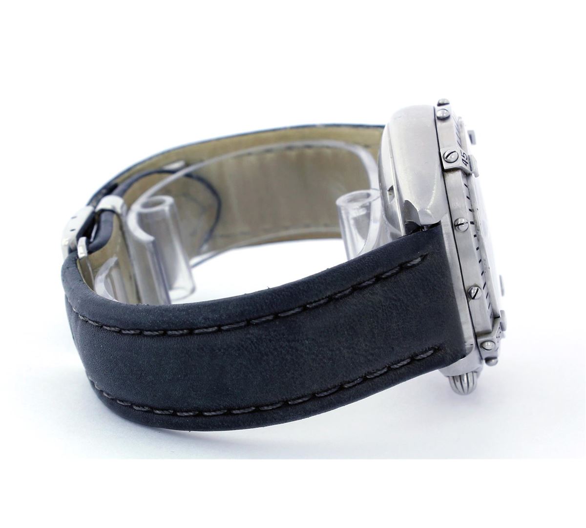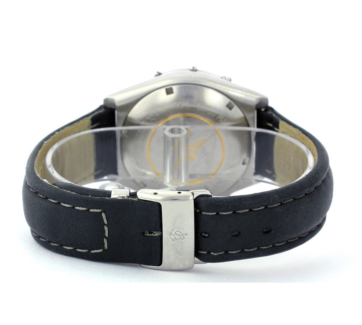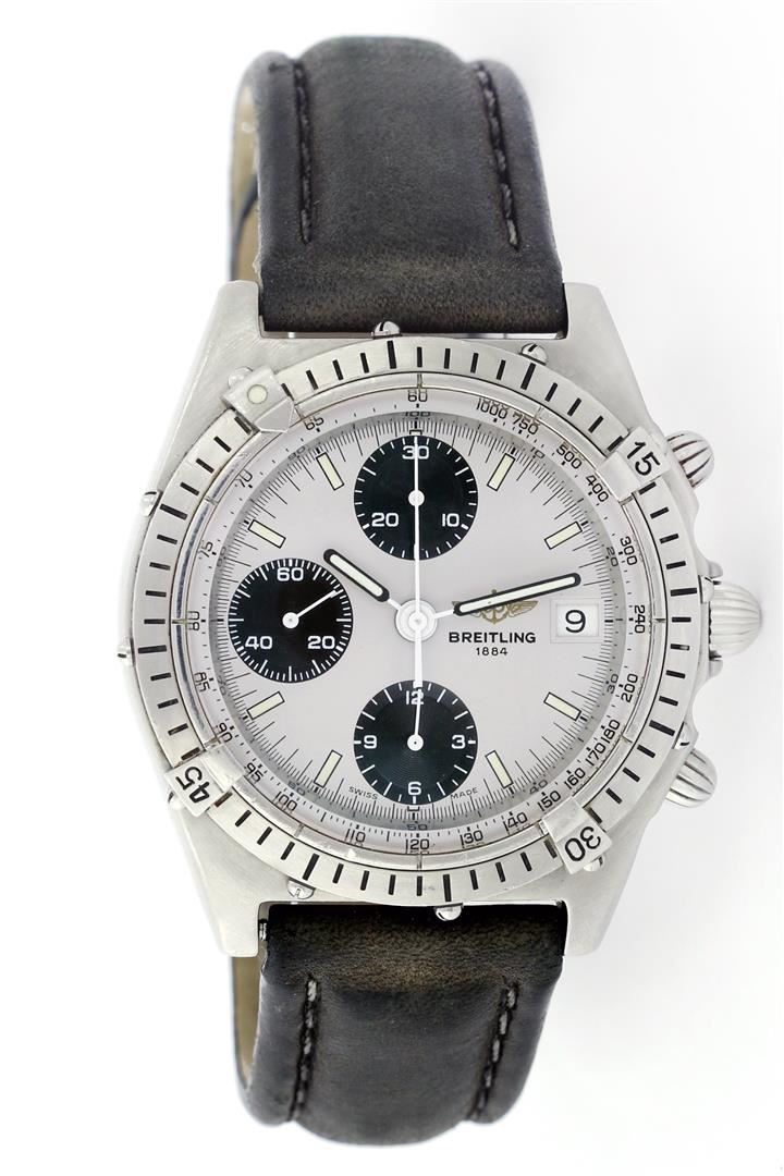 One Gents Breitling Pilot Chronograph, Serviced & Electronically Tested, Case:39mm, Stainless Steel Crown, Bezel: Unidirectional Stainless Steel Bezel, Crystal: Sapphire Lens. Movement: Automatic Winding Movement Dial: Silver Dial With Index Hour Markers and Three Sub Dials. Model# A13047 Condition: G-5 Fine. Band: Grey Leather Band, Adjustable. Standard Buckle, With Breitling Clasp Mark.