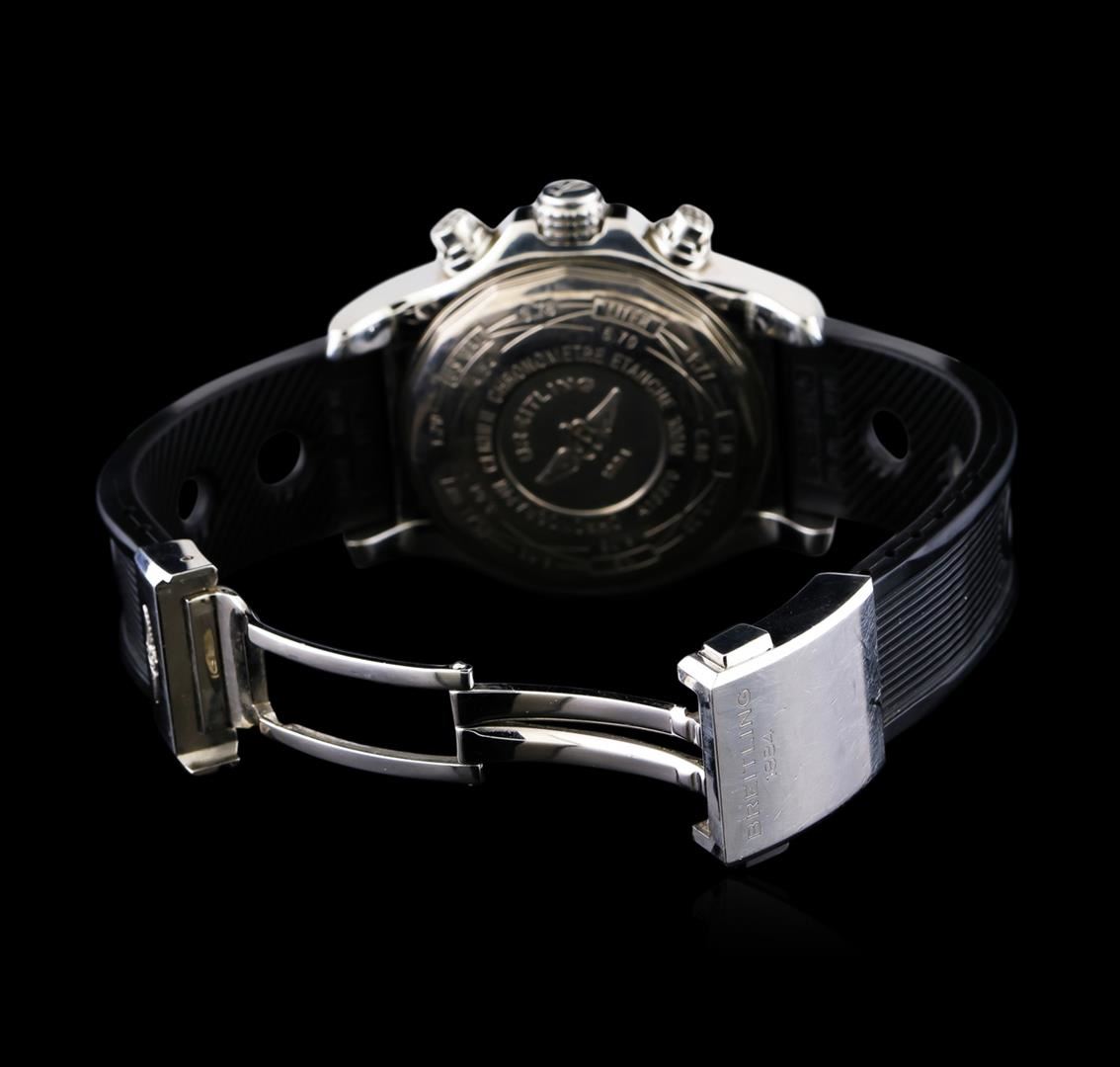One Breitling Super Avenger watch featuring: Case: Stainless steel. Bezel: Stainless steel, rotating. Crystal: Sapphire. Dial: Black color; silver-tone luminous hands; silver tone index markers. Features: Chronograph; date window located at the 3 o'clock position. Bracelet: Black rubber. Condition: Surface scratches can be seen, but otherwise there are no major signs of wear.
