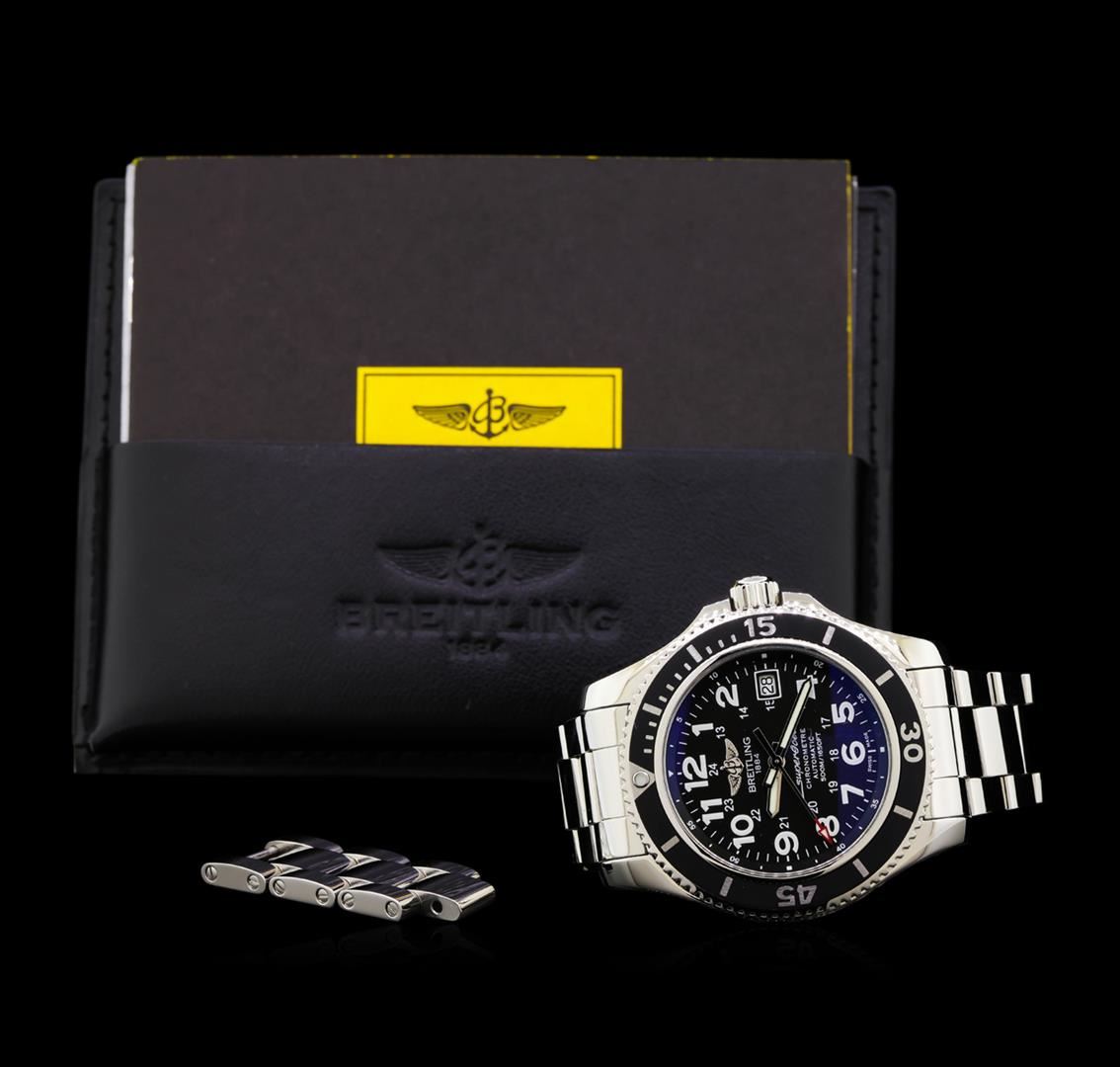 One gents, Breitling SuperOcean II 42 wristwatch electronically tested Stainless Steel, Case: 42mm diameter, Case Back: engraved with the manufacturer's information and the manufacturer's logo in high relief, Water Resistant: 500 meters / 1640 feet, Crown: scalloped, with logo, twin locking gaskets, and set within protective shoulders. Breitling SuperOcean II Bezel: Black color, rubber-molded fluted uni-directional, with countdown of the last 15 dive-time minutes and a triangle with a luminescent marker at 12 o'clock. Crystal: synthetic sapphire. Movement: Breitling 17, Automatic ETA 2824-2, Power Reserve: 42 Hours Breitling signed Dial: Black, with luminous baton pointed hands, indices, and numerals, Date Window: three o'clock position date display, Breitling Stainless Steel Bracelet: Professional III, Seven inch length, adjustable. Breitling Concealed deployment clasp, with logo. Condition: G-8 Mint.. Total Weight of Wristwatch 164.48gm. AIG Appraised at $3,900.00.